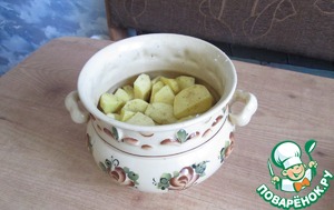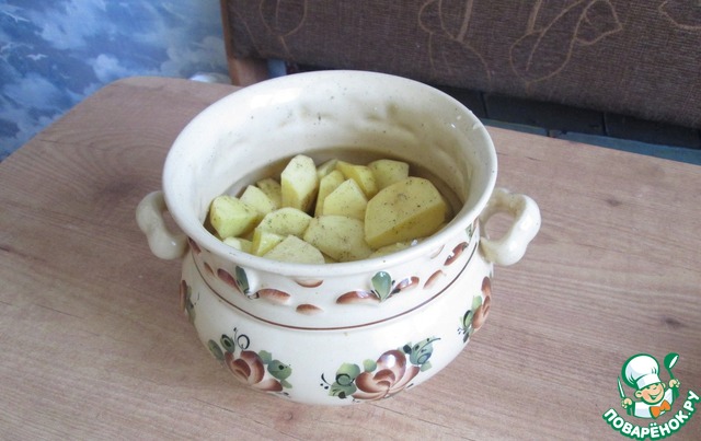 Почистили картошку, нарезали большими кусочками. Выкладываем в горшочек. Солим, перчим, я добавляю лавровый лист, но это на любителя. Режем лук и посыпаем с верху картошки. Мои лук не едят, потому я готовила без лука : (