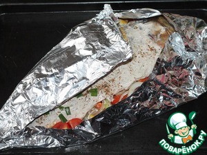 Прикрываем овощи фольгой, а карпа оставляем открытым.
