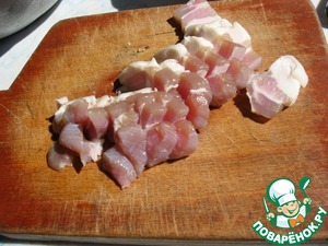 Картофелину разрезать на 3-4 части и нанизать на шпажки по 2 штучки, перемежая кусочки картофеля со свиным салом -