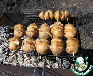 Выкладываем на решетку мангала и жарим над углями до готовности картофеля
