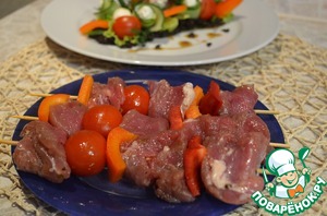 насадить на шпажки чередуя вместе с мясом и помидорками черри. -