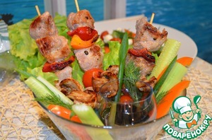 Деревянные шпажки предварительно замочить в холодной воде, для того, чтобы они не расслаивались на заусенцы, пока вы будете насаживать на них мясо и овощи.
