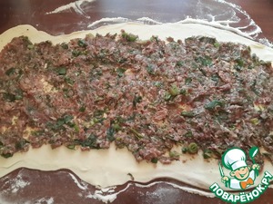 Слоеное тесто (рулон)разворачиваем во всю длину и слегка раскатываем его в ширину, на раскатанное тесто первым слоем выкладываем фарш с зеленью