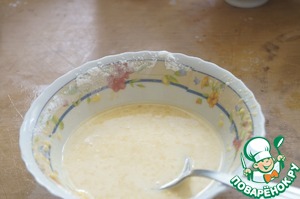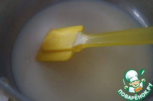 Тоненькой струйкой влить половину молока с сахаром. При этом постоянно помешиваем чтобы желтки не заварились.