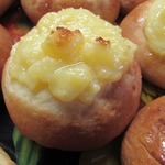 Затем возьмем стакан и сделаем выемки как для ватрушек, наполним пустоту кремом, на одну булочку уходит примерно 1 ч. л. крема.