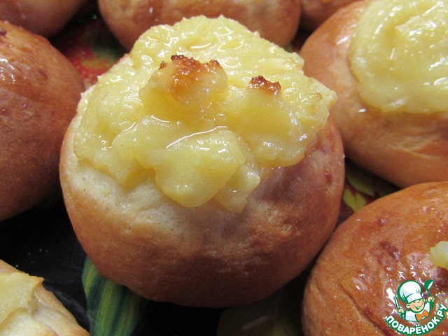 Выкладываем булочки на противень и смазываем их взболтанным яйцом. Выпекаем в разогретой до 190 градусов духовке 20 минут.