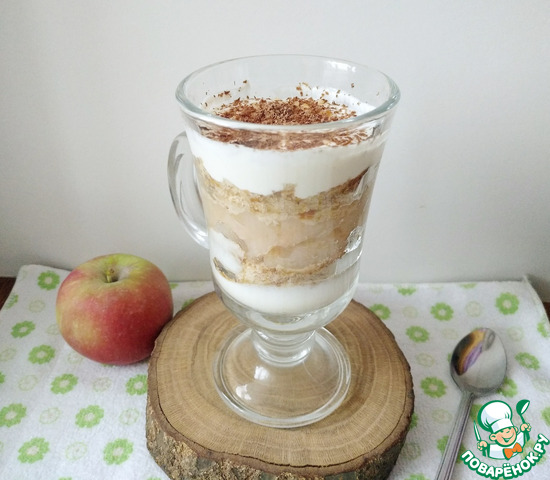 А затем в креманки или стаканы выложить слоями десерт: крем, пряники, яблоки, пряники и завершаем кремом. Убираем в холодильник на 2 часа. Слой яблок хорошо пропитывает слои пряника и десерт получается мягким, воздушным с яблочной кислинкой.