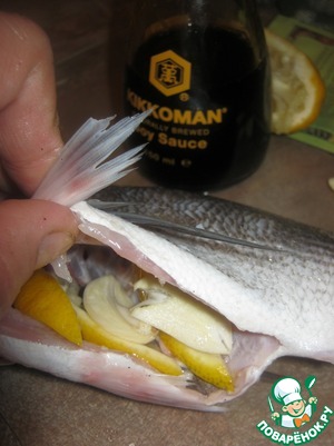 Через 10 минут начиняем брюшко ломтиком лимона и зубком чеснока