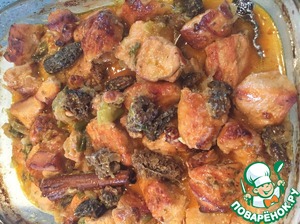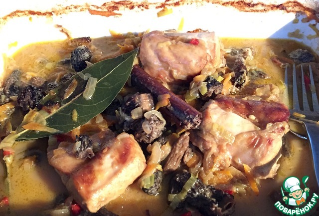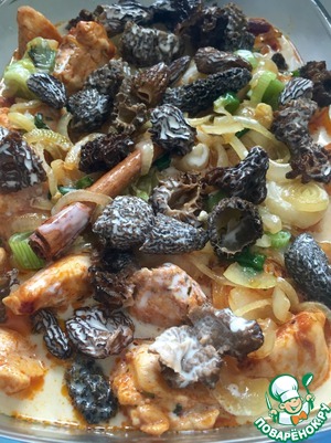 • Переложите курочку в огнеупорную форму, сверху высыпьте обжаренный лук, выложите сморчки, слейте воду от грибов ( не до конца. Там точно будет песок). Положите веточку корицы.