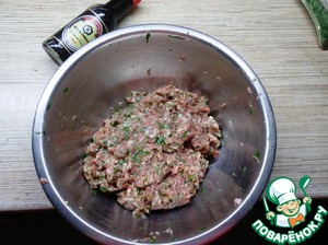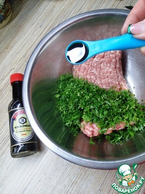 Добавить к фаршу зелень, соевый соус, соль, перец и яйцо.