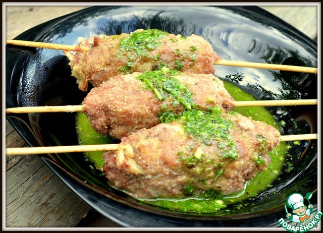 Приготовить угли. Фарш налепить на шампура. Если он все-таки пытается отвалиться от шампура, не бойтесь, продолжайте формировать продолговатую котлетку, проворачивая шампур в руке, пока она не будет хорошо держаться на шампуре.