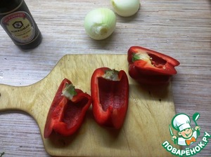Болгарский перец разрезать на четыре части, не удаляя плодоножку, убрать семена и перегородки.