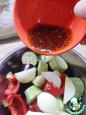Готовил на решеточке, предварительно нанизав на бамбуковые шпажки, чтоб овоща не разбегались. Единственно, в следующий раз увеличу количество соевого соуса и чеснока в маринаде раза в два- многие из гостей досаливали...