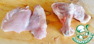 Снимем кожу с куриного бедра и освободим мясо от косточки.