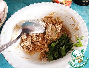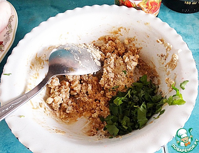 Разломать сыр дорблю, добавить пропущенный через пресс чеснок и 2 ст. л. соевого соуса ТМ Kikkoman и 2 ст. л. нарезанной петрушки.
