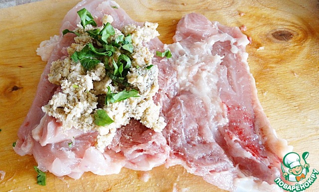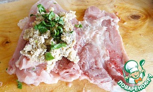 На кусочек отбитого мяса с краю положить нашу начинку.