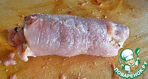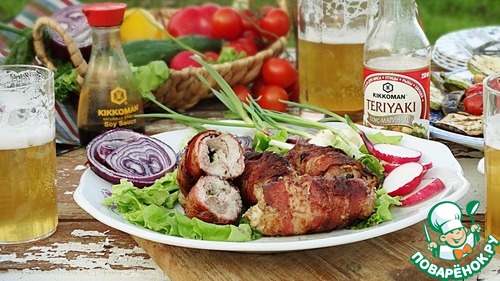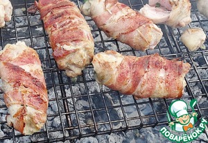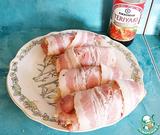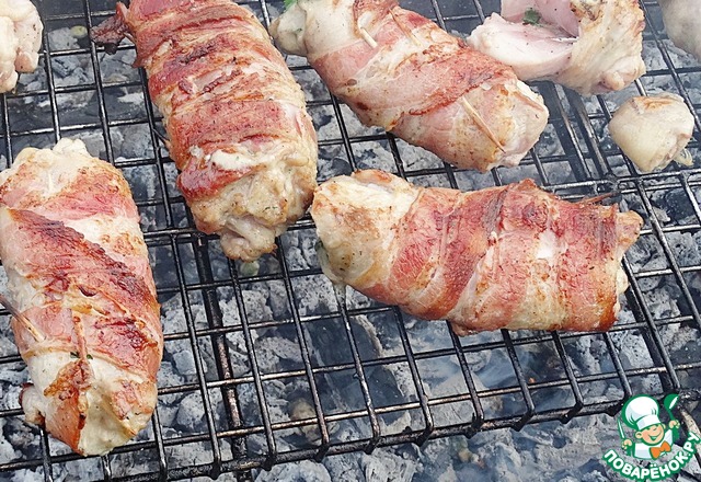 [+5]Я делала из куриных четвертей,но их было только 2, поэтому взяла ещё куриную грудку. Начинки получилось не много ,относительно мяса,поэтому я её размазала тонким слоем ,по-всему мясу,завернула рулетом. Бекон у меня оказался недостаточно длинным,немножко замучилась с обёртыванием,некоторые кусочки просто ложила на рулетики. Запекала сначала в духовке на решотке ,под грилем,но увидев,что плохо пропекалось,пришлось переложить на протвень и время от времени переворачивать.