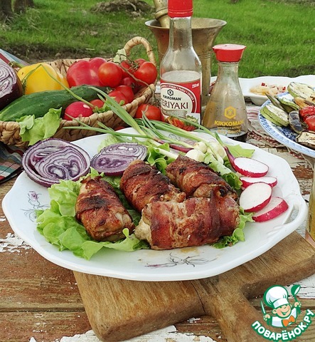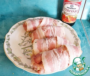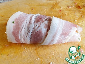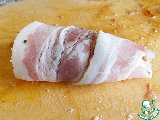 Обернём его полоской бекона и заколем зубочистками или деревянными шпажками.