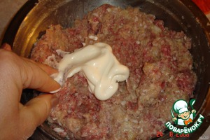 Фарш как на котлеты, только я добавила немного манки для пышности и майонеза для нежности(1 ст.ложка).