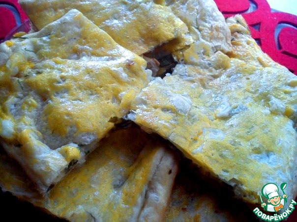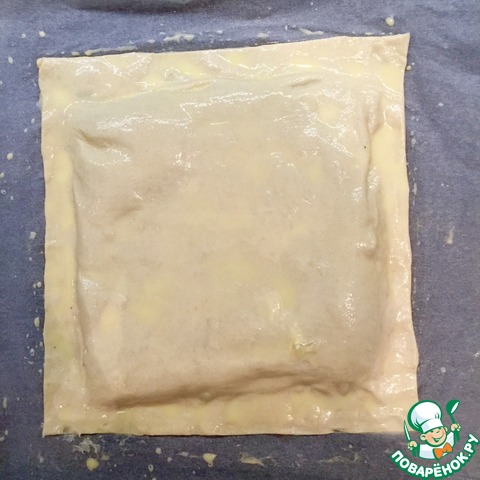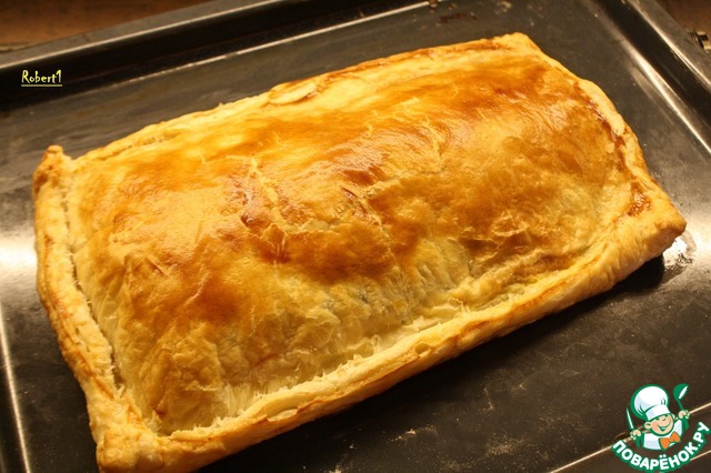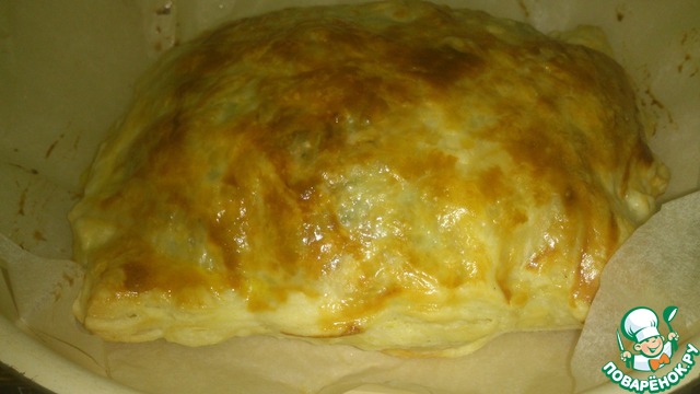 Кладем сверху второй кусок теста, хорошенько закрепляем края и обмазываем желтком с молоком. Ставим в духовку при 200 градусах минут на 20. Приглядывайте. Как всё хорошенько подрумянится-готово!