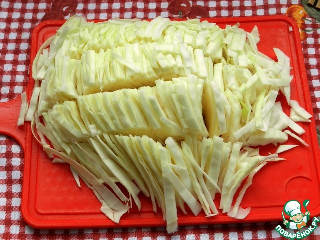 Всё просто: капусту порезать. Пересыпать в ёмкость, в которой будете смешивать салат.
