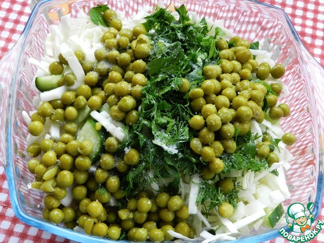 Добавить зелёный горошек, порезанную зелень, соль, майонез, всё перемешать.