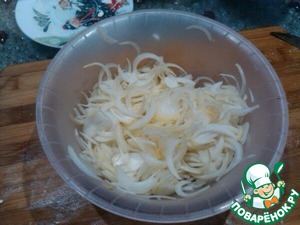 Далее, нарежем лук, очень тонкими дужками!