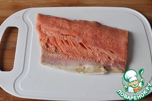 Берём кусок филе с кожей (у нас его называют боковиной) любой рыбы из лососёвых пород. У меня - самая бюджетная у нас горбуша.
