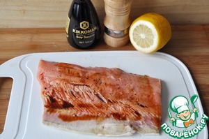 Посыпаем филе свежемолотой смесью перцев, поливаем соком лимона ( 2 ст. ложки) и соевым соусом ТМ "Киккоман" (2 ст. ложки), отставляем мариноваться.