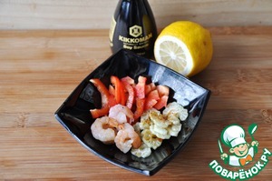 Чистим варено-мороженные креветки, тонкими полосками нарезаем красный болгарский перец и сельдерей. Поливаем соком лимона (1 ст. ложка), соевым соусом ТМ "Киккоман" (1 ст. ложка), посыпаем свежемолотой смесью перцев.