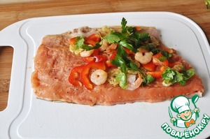 Берём рыбный пласт и слегка приминаем мякоть рукой, чтобы она легче сворачивалась. Кладём сверху маринованные овощи, креветки и петрушку.