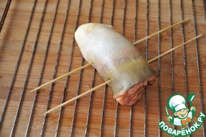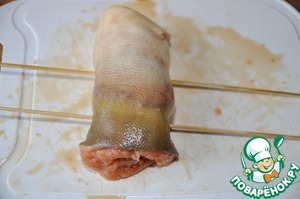 Плотно сворачиваем рулет и протыкаем деревянными шампурами. Для удобства, чтобы рулет не развалился, я взяла два шампура. Можно использовать и небольшие металлические шампура. Деревянные шампура рекомендую предварительно замочить в воде, чтобы они не сгорели.