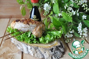 Исключительно вкусные рулеты из филе любых крупных лососёвых рыб на шампурах, запечённые на углях.