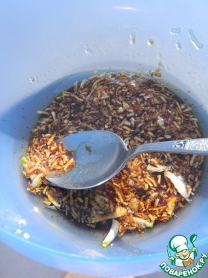 Чеснок натереть на мелкой терке, добавить масло и соевый соус, перемешать.