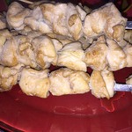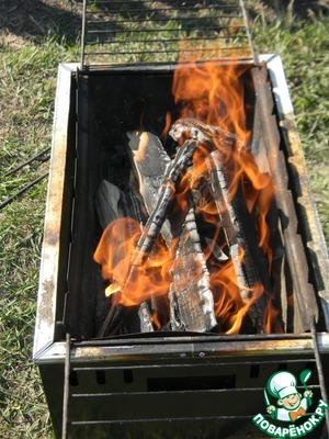 Пока нагорают угли, нанизываем полосочки на деревянные шпажки (их предварительно замочить в воде, чтобы не сгорели), чеснок желательно снять с курочки.