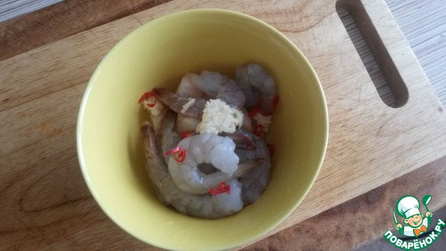 Очищаем креветки, оставив хвостик. Далее выдавливаем чесночок в отдельную емкость, режем тонко перчик чили (без семян). Берем 1/3 чесночка, смешиваем с 3 ложками оливкового масла и чили. В полученную смесь отправляем креветки и гребешки. Перемешиваем и оставляем мариноваться.