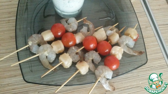 Вынимаем шпажки из воды, обсушиваем. На каждую нанизываем пару креветок, 1 черри, 1-2 гребешка.