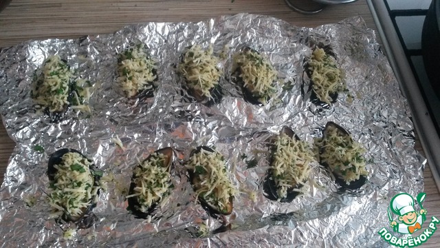 Мидии - до расплавления сыра и появления слегка золотистой корочки (3-4 минуты).