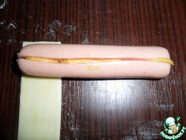 Далее тесто разрезаем на полоски по 2 см, в каждой сосиске делаем надрез по всей длине и густо внутри промазываем горчицей. Кладем на край полоски нашу сосиску. -
