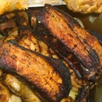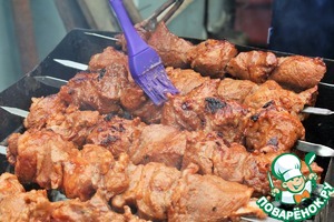 Этот шашлык за счет добавления меда имеет свойство подгорать. Мы используем силиконовую кисть с помощью которой остатками маринада смазываем шашлык.
