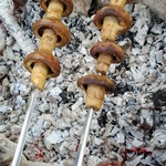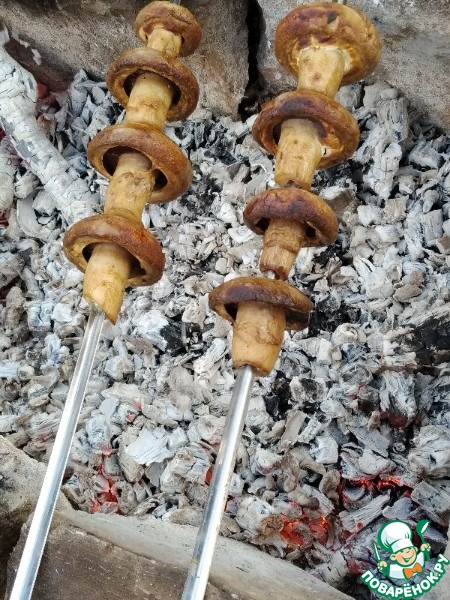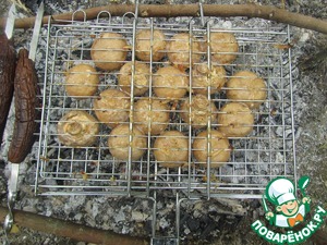 Выкладываем шампиньоны на решетку и обжариваем на углях, периодически переворачивая решетку, до золотистого колера.