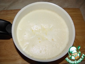 Продолжая взбивать, ввести растопленное масло, сметану и лимонад