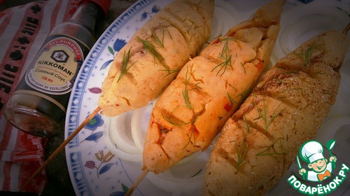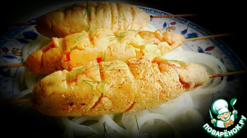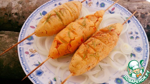 Затем аккуратно нанизать на деревянные шпажки, смазав их растительным маслом (предварительно подержать шпажки в воде). Выложить на решетку или противень. Готовить минут 15-20 при 220-240 град. Ну и, конечно, ориентируясь по своей духовке!