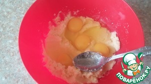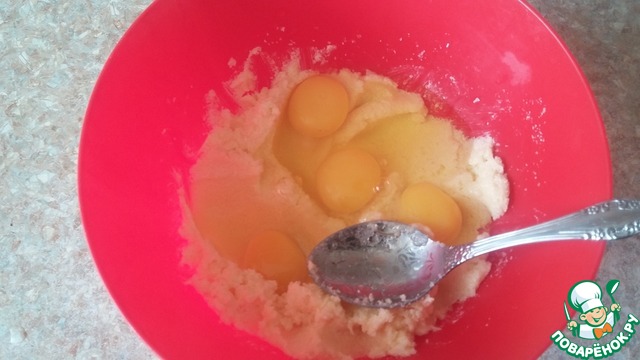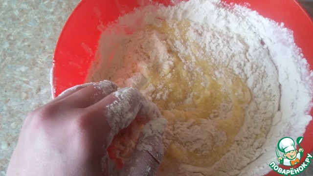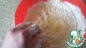 Добавляем просеянную муку и разрыхлитель теста и... И перемешиваем:))