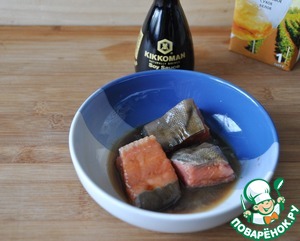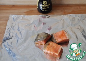 Поливаем рыбу соевым соусом ТМ "Киккоман" и белым сухим вином. Оставляем мариноваться на 10-15 минут. -