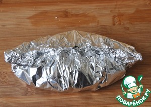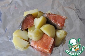 Берём фольгу, складываем вдвое, чтобы не порвалась, кладём посредине маринованную рыбу.