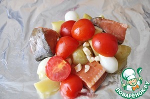 Далее сверху кладём луковички шалота, измельчённый чеснок и нарезанные пополам помидоры черри.