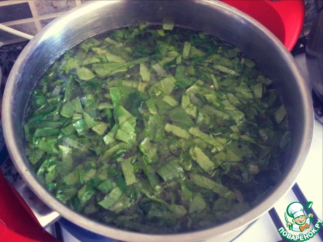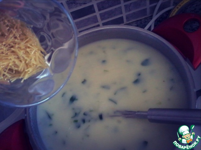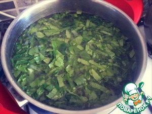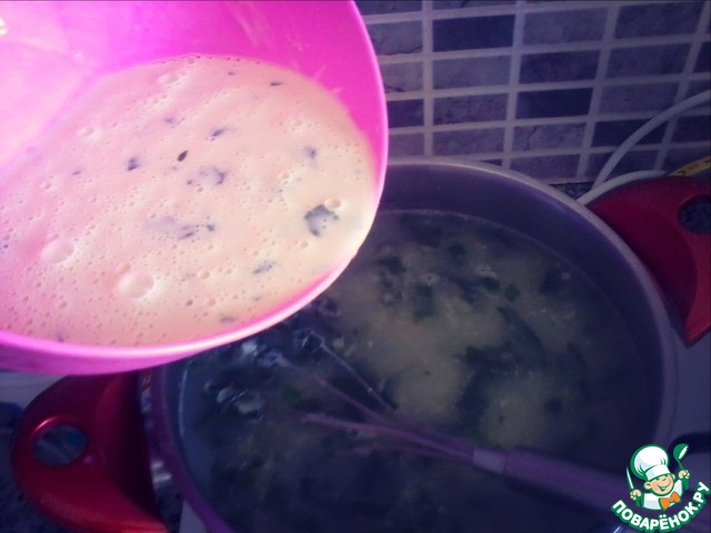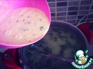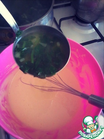 При постоянном помешивании в полученную смесь, медленно вводим 2 поварешки воды со шпинатом.