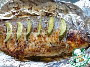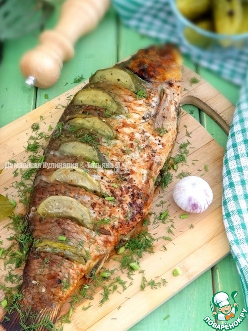 Спешу поделиться с вами наивкуснейшим рецептом приготовления карпа на углях... Маринованный в салатном соусе с кунжутом от Киккоман, фаршированный сладкими маринованными огурчиками с луком и укропом, карп с дымком - получается удивительно нежным, с пикантными маринованными нотками и потрясающим ароматом!