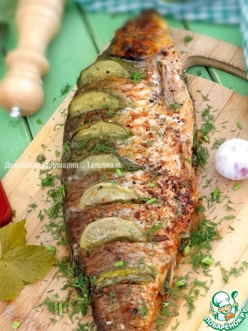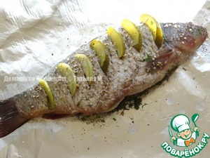 Готового карпа можно подавать прямо в фольге, можно переложить в посудину или на деревянную подставку и посыпать зеленью;